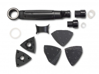 2 Schleifplatten, gelocht; je 5 Schleifblätter, gelocht, Korn 60, 80, 120; 1 Absaughaube mit Saugrohr; 2 Schlauchtüllen für Schlauchverschluss Ø 27 und 32 mm sowie 2 Adapter zum Anschluss an die gebräuchlichsten Haushalts-Entstauber. FMM 250 / 250 Q, FMT 250 / 250Q, FMT 250 SL / 250 QSL